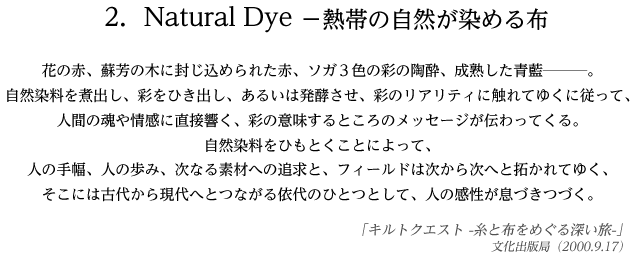 Two seasons alternate on the island, dry and rainy. Sunlight is lavish year-round, and vegetation grows thick. Late at night when the moon is full, large dewdrops hang from the tips of leaves. Gazing at them, I sense the overflowing vitality in plants that sustains so many of the living things on this planet. Colors born from the plant world carry something of the essence of life. It is that vital life force that I work with; that is why I take such pains with the materials for my quilts.